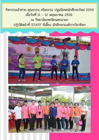 กิจกรรมเข้าค่าย คุณธรรม จร ยธรรม ปฐมนิเทศนักศึกษาใหม่ 2559 เมื อวันที 11 – 12 พฤษภาคม 2559 ณ ว ทยาลัยเทคนิคนครนายก ปฏิบัติหน้าที STAFF พี เลี ยง นักศึกษาองค์การว ชาชีพฯ