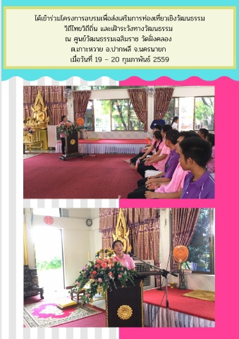 ได้เข้าร่วมโครงการอบรมเพื อส่งเสร มการท่องเที ยวเชิงวัฒนธรรม ว ถีไทยว ถีถิ น และเฝ าระวังทางวัฒนธรรม ณ ศูนย์วัฒนธรรมเฉลิมราช วัดฝ งคลอง ต.เกาะหวาย อ.ปากพลี จ.นครนายก เมื อวันที 19 – 20 กุมภาพันธ์ 2559
