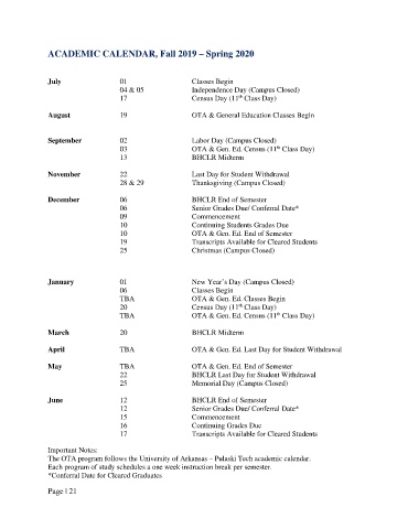 The OTA program follows the University of Arkansas – Pulaski Tech academic calendar.