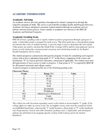 BHCLR utilizes a grading scale to signify student academic progression through a program of