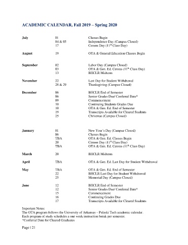 The OTA program follows the University of Arkansas – Pulaski Tech academic calendar.