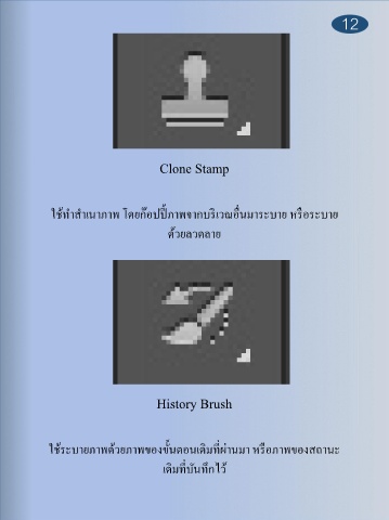 12 Clone Stamp ่ ื ื ิ ใช้ท าส าเนาภาพ โดยก๊อปปภาพจากบรเวณอนมาระบาย หรอระบาย ี้ ด้วยลวดลาย History Brush ี ื ่ ิ ใช้ระบายภาพด้วยภาพของขั้นตอนเดมทผ่านมา หรอภาพของสถานะ เดมทบันทกไว้ ิ ึ ี่