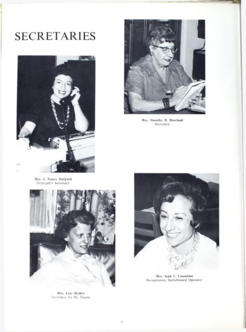 SECRETARIES Mrs. Dorothy E. Howland Secretary Mrs. J. Nancy Dafgard Principal’s Secretary Mrs. Jean C. Cosentino Receptionist, Switchboard Operator Mrs. Lois Holden Secretary for Mr. Dugan 10