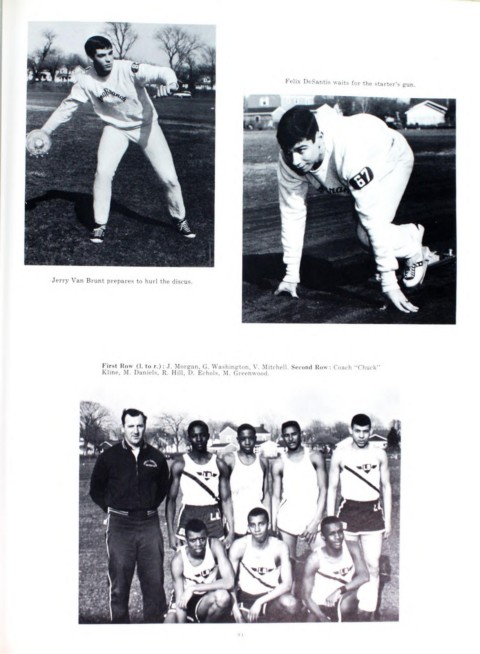Felix DeSantis waits for the starter’s gun. Jerry Van Brunt prepares to hurl the discus. First Row (I. to r.): J. Morgan, G. Washington, V. Mitchell. Second Row: Coach “Chuck” Kline, M. Daniels, R. Hill, D. Echols, M. Greenwood. 93