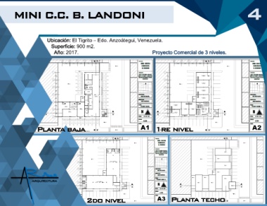 MINI C.C. B. LANDONI 4 Ubicación: El Tigrito – Edo. Anzoátegui, Venezuela. Superficie: 900 m2. Año: 2017. Proyecto Comercial de 3 niveles. Planta baja 1re nivel ARQUITECTURA 2do nivel Planta techo