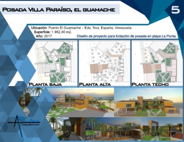 Posada Villa Paraíso, el guamache 5 Ubicación: Puerto El Guamache – Edo. Nva. Esparta, Venezuela. Superficie: 1.982,40 m2. Año: 2017. Diseño de proyecto para licitación de posada en playa La Punta. Planta baja Planta alta Planta techo ARQUITECTURA