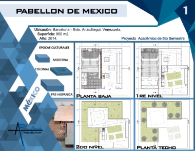 PABELLON DE MEXICO 1 Ubicación: Barcelona – Edo. Anzoátegui, Venezuela. Superficie: 900 m2. Año: 2014. Proyecto Académico de 6to Semestre EPOCAS CULTURALES MODERNA PRE-HISPANICA Planta baja 1re nivel ARQUITECTURA 2do nivel Planta techo