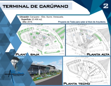 TERMINAL DE CARÚPANO 2 Ubicación: Carúpano – Edo. Sucre, Venezuela. Superficie: 23.456 m2. Año: 2016. Proyecto de Tesis para optar al titulo de Arquitecto. Planta baja Planta alta ARQUITECTURA Planta techo