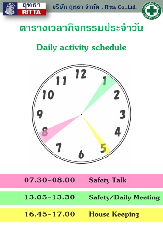 บริษัท ฤทธา จ ากัด , Ritta Co.,Ltd. ตารางเวลากิจกรรมประจ าวัน Daily activity schedule 07.30-08.00 Safety Talk 13.05-13.30 Safety/Daily Meeting 16.45-17.00 House Keeping