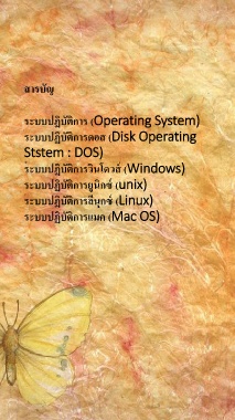 สำรบัญ ระบบปฏิบัติกำร (Operating System) ระบบปฏิบัติกำรดอส (Disk Operating Ststem : DOS) ระบบปฏิบัติกำรวินโดวส์ (Windows) ระบบปฏิบัติกำรยูนิกซ์ (unix) ระบบปฏิบัติกำรลีนุกซ์ (Linux) ระบบปฏิบัติกำรแมค (Mac OS)