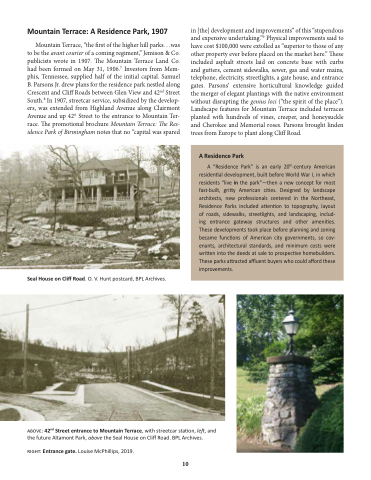 Mountain Terrace, “the first of the higher hill parks. . .was to be the avant courier of a coming regiment,” Jemison & Co. publicists wrote in 1907. The Mountain Terrace Land Co. had been formed on May 31, 1906.7 Investors from Mem- phis, Tennessee, supplied half of the initial capital. Samuel B. Parsons Jr. drew plans for the residence park nestled along Crescent and Cliff Roads between Glen View and 42nd Street South.8 In 1907, streetcar service, subsidized by the develop- ers, was extended from Highland Avenue along Clairmont Avenue and up 42st Street to the entrance to Mountain Ter- race. The promotional brochure Mountain Terrace: The Res- idence Park of Birmingham notes that no “capital was spared