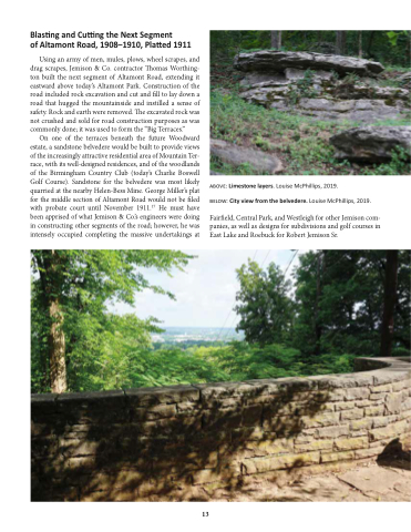 On one of the terraces beneath the future Woodward estate, a sandstone belvedere would be built to provide views of the increasingly attractive residential area of Mountain Ter- race, with its well-designed residences, and of the woodlands of the Birmingham Country Club (today’s Charlie Boswell Golf Course). Sandstone for the belvedere was most likely quarried at the nearby Helen-Bess Mine. George Miller’s plat for the middle section of Altamont Road would not be filed with probate court until November 1911.17 He must have been apprised of what Jemison & Co.’s engineers were doing in constructing other segments of the road; however, he was intensely occupied completing the massive undertakings at