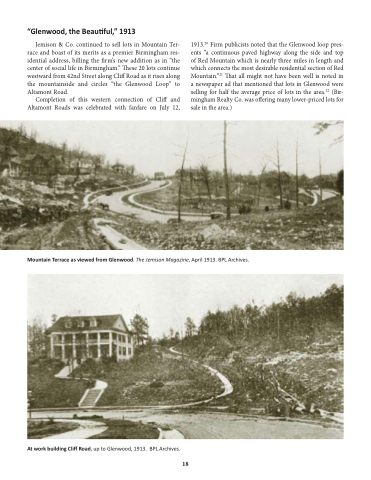 1913.20 Firm publicists noted that the Glenwood loop pres- ents “a continuous paved highway along the side and top of Red Mountain which is nearly three miles in length and which connects the most desirable residential section of Red Mountain.”21 That all might not have been well is noted in a newspaper ad that mentioned that lots in Glenwood were selling for half the average price of lots in the area.22 (Bir- mingham Realty Co. was offering many lower-priced lots for sale in the area.)