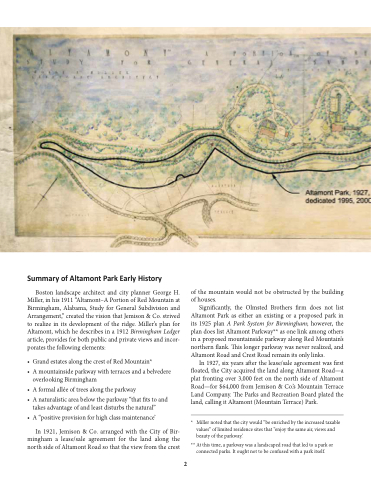 Significantly, the Olmsted Brothers firm does not list Altamont Park as either an existing or a proposed park in its 1925 plan A Park System for Birmingham; however, the plan does list Altamont Parkway** as one link among others in a proposed mountainside parkway along Red Mountain’s northern flank. This longer parkway was never realized, and Altamont Road and Crest Road remain its only links.