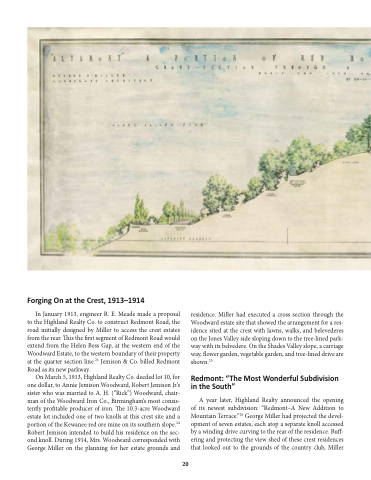 In January 1913, engineer R. E. Meade made a proposal to the Highland Realty Co. to construct Redmont Road, the road initially designed by Miller to access the crest estates from the rear. This the first segment of Redmont Road would extend from the Helen Bess Gap, at the western end of the Woodward Estate, to the western boundary of their property at the quarter section line.23 Jemison & Co. billed Redmont Road as its new parkway.
