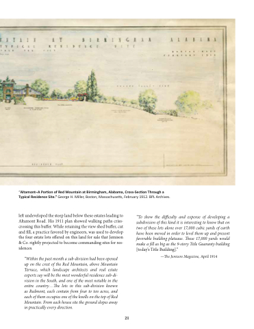 left undeveloped the steep land below these estates leading to Altamont Road. His 1911 plan showed walking paths criss- crossing this buffer. While retaining the view shed buffer, cut and fill, a practice favored by engineers, was used to develop the four estate lots offered on this land for sale that Jemison & Co. rightly projected to become commanding sites for res- idences.