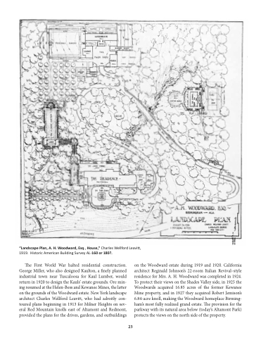on the Woodward estate during 1919 and 1920. California architect Reginald Johnson’s 22-room Italian Revival–style residence for Mrs. A. H. Woodward was completed in 1924. To protect their views on the Shades Valley side, in 1925 the Woodwards acquired 16.85 acres of the former Kewanee Mine property, and in 1927 they acquired Robert Jemison’s 6.84-acre knoll, making the Woodward homeplace Birming- ham’s most fully realized grand estate. The provision for the parkway with its natural area below (today’s Altamont Park) protects the views on the north side of the property.
