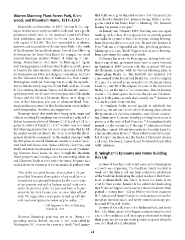 Meanwhile, on November 16, 1917, Jemison & Co., hop- ing to develop more easily accessible lands and turn a profit, purchased unsold land in the Avondale Land Co.’s Forest Park subdivision and formed the Forest Park Realty Co. with capital of $25,000. This firm proceeded to subdivide, improve, and successfully sell lots in Forest Park to the north of the Mountain Terrace development. Several days following its formation, the Forest Park Realty Co. engaged the noted national landscape architect Warren H. Manning of Cam- bridge, Massachusetts, who knew the Birmingham region well, having prepared and supervised highly successful plans to beautify the city’s streetcar railways, prepared a City Plan for Birmingham in 1914, and designed recreational facilities for the Tennessee Coal, Iron & Railroad Co., then a major Birmingham employer. Manning was to study the opportu- nity to link the newly acquired Forest Park lands to Jemison & Co.’s existing Mountain Terrace and Redmont’s undevel- oped properties: the 40-acre Glenwood just east of Mountain Terrace and the 160-acre Mountain Home lands along the crest of Red Mountain, just east of Altamont Road. Man- ning’s preliminary study for this development was to include advertising matter, literature, and suggestions.