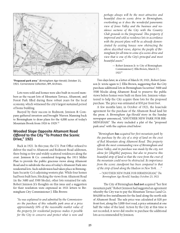 “Birmingham has acquired her first mountain park by the purchase by the city of a strip of land on the crest of Red Mountain along Altamont Road. This property affords the most commanding view of Birmingham and Jones Valley, and its purchase was made by the city, not alone for [illegible] purposes, but also to preserve this beautiful strip of land so that the view from the crest of the mountain could never be obstructed. Its importance from the scenic standpoint has been compared to that of the strip of land along the Hudson in New York. . . .”
