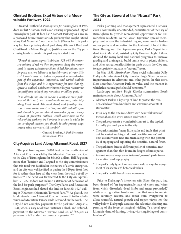 Olmsted Brothers’ A Park System for Birmingham of 1925 does not list Altamont Park as an existing or proposed City of Birmingham park. It does list Altamont Parkway as a link in a proposed future mountainside parkway that might extend along Red Mountain’s northern flank. (Pieces for this park- way had been privately developed along Altamont Road and Crest Road in Milner Heights.) Justification for the City pur- chasing lands to create this parkway is stated thus: