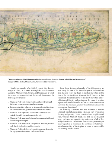 In summary, Altamont Park was intended to remain a natural, forested green space, enhanced only by selective cleaning and pruning. It was conceived as a neighborhood park, whereas Altamont Road, one link in an imagined longer parkway, was meant for the enjoyment of all of Bir- mingham’s citizens and visitors. Furthermore, preserving as much vegetation as possible on the north face of Red Moun- tain allows the City of Birmingham to retain its most notable and defining natural feature.
