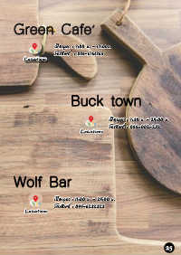 Green Cafe' เปิดเวลา : 8:00 น. - 17:00น. โทรศัพท์ : 086-6766865 Locations Buck town เปิดเวลา : 8:30 น. - 24:00 น. โทรศัพท์ : 055-002-232 Locations Wolf Bar เปิดเวลา : 11:00 น. - 24:00 น. โทรศัพท์ : 094-6232323 Locations 25