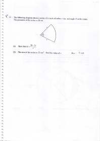 (,0 The foltowrng diagraa shorvs a sector of a circle of radius rcm, a.d angle 0 at thr ceatre The pe.rimeter of tlte sector is 20 cm. (a) Shon that , -2o-2r . r .. b^t O) TLe area of the sector is 25 cmr. Find the value of r., 5 cn