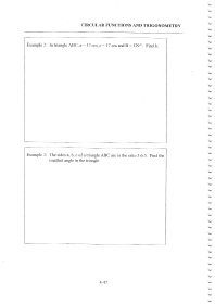 CIRCULAR FUNCTIONS AND TRIGONOME'I'RY : Example 2: ln triangle ABC. a 12cm,c: 17cmandB:129.. Findb. Example 3: 'fhe sides a, b, c of a triangle ABC are in the ratio 3:6:5. Find the smallest angle in the triangle 4-47