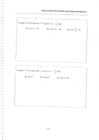 CIRCT-]LAR T'UNCTIONS AND TRIGONOMEI'RY Example 4: Given thatcos d = k and 0 < e < find | (a) cos (z + d) (b) cos(2r _ 0) (c) cos aag') 1 Example 5: Given that sind: k and 0.x <a find 2 (a) tan 0 (b) cosec 0 (i sec (zr+0) 4-tt