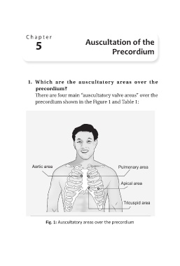 Chapt er 5 Auscultation of the Precordium 1. Which are the auscultatory areas over the precordium? There are four main “auscultatory valve areas” over the precordium shown in the Figure 1 and Table 1: Fig. 1: Auscultatory areas over the precordium