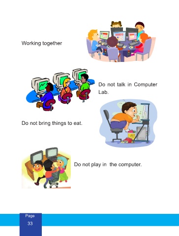 Working together Do not talk in Computer Lab. Do not bring things to eat. Do not play in the computer. Page 33