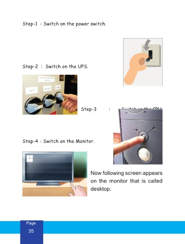 Step-1 : Switch on the power switch. Step-2 : Switch on the UPS. Step-3 : Switch on the CPU. Step-4 : Switch on the Monitor. Now following screen appears on the monitor that is called desktop. Page 35