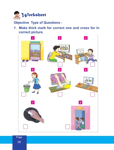 Worksheet Objective Type of Questions : 1. Make thick mark for correct one and cross for in correct picture. Page 38