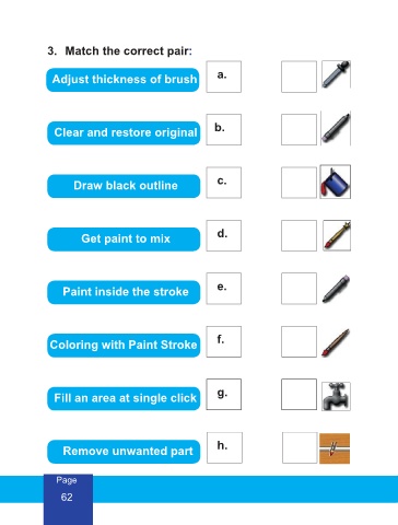 3. Match the correct pair: Adjust thickness of brush a. Clear and restore original b. Draw black outline c. Get paint to mix d. Paint inside the stroke e. Coloring with Paint Stroke f. Fill an area at single click g. Remove unwanted part h. Page 62
