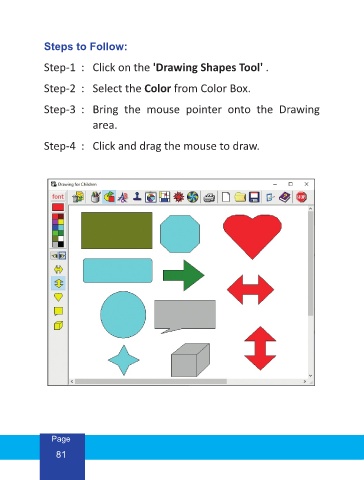 Steps to Follow: Step-1 : Click on the 'Drawing Shapes Tool' . Step-2 : Select the Color from Color Box. Step-3 : Bring the mouse pointer onto the Drawing area. Step-4 : Click and drag the mouse to draw. Page 81