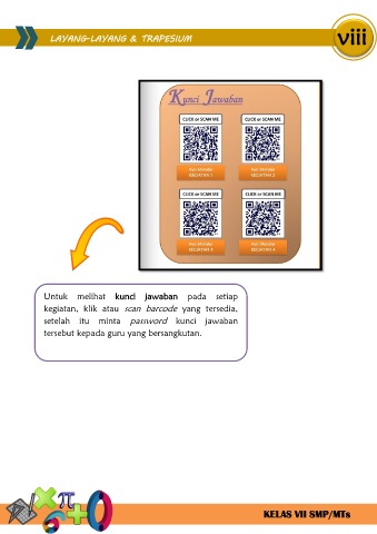viii LAYANG-LAYANG & TRAPESIUM Untuk melihat kunci jawaban pada setiap kegiatan, klik atau scan barcode yang tersedia, setelah itu minta password kunci jawaban tersebut kepada guru yang bersangkutan. KELAS VII SMP/MTs