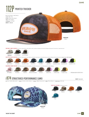 KRYPTEK CAMO COLORS: First color is crown and visor camo, button, and eyelets. Second color is crown back mesh and contrast stitching on front panels and visor. Kryptek Camo 100% Polyester.