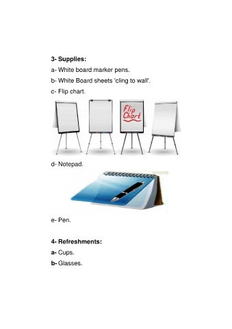 3- Supplies: a- White board marker pens. b- White Board sheets 'cling to wall'. c- Flip chart. d- Notepad. e- Pen. 4- Refreshments: a- Cups. b- Glasses.