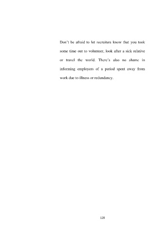 Don‘t be afraid to let recruiters know that you took some time out to volunteer, look after a sick relative or travel the world. There‘s also no shame in informing employers of a period spent away from work due to illness or redundancy. 128