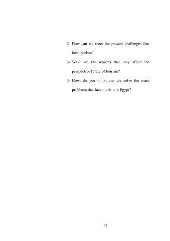 2- How can we meet the present challenges that face tourism? 3- What are the reasons that may affect the perspective future of tourism? 4- How, do you think, can we solve the main problems that face tourism in Egypt? 92