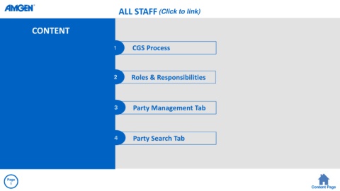 ALL STAFF (Click to link) CONTENT 1 CGS Process 2 Roles & Responsibilities 3 Party Management Tab 4 Party Search Tab Page 1 Content Page