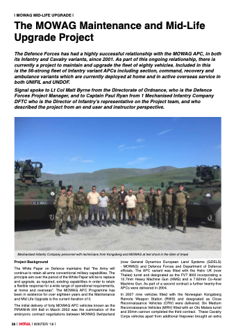 The Defence Forces has had a highly successful relationship with the MOWAG APC, in both its Infantry and Cavalry variants, since 2001. As part of this ongoing relationship, there is currently a project to maintain and upgrade the fleet of eighty vehicles. Included in this