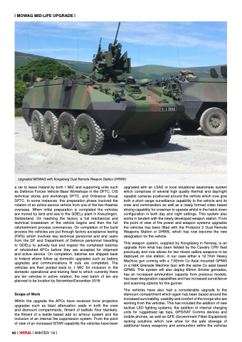 Within the upgrade the APCs have received force projection upgrades such as blast attenuation seats in both the crew and dismount compartments, fitment of ballistic floor blankets, the fitment of a textile based add on armour system and the inclusion of an internal fire suppression system. From the point of view of an increased ISTAR capability the vehicles have been
