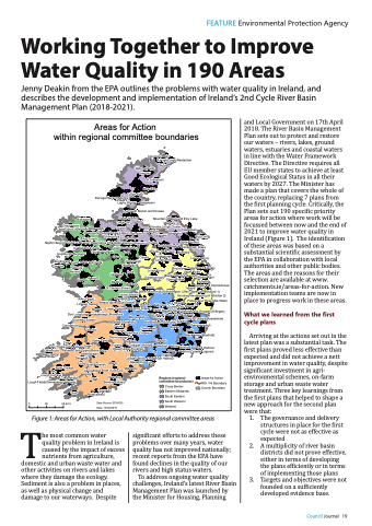 and Local Government on 17th April 2018. The River Basin Management Plan sets out to protect and restore our waters – rivers, lakes, ground waters, estuaries and coastal waters in line with the Water Framework Directive. The Directive requires all EU member states to achieve at least Good Ecological Status in all their waters by 2027. The Minister has made a plan that covers the whole of the country, replacing 7 plans from the first planning cycle. Critically, the Plan sets out 190 specific priority areas for action where work will be focussed between now and the end of 2021 to improve water quality in Ireland (Figure 1). The identification of these areas was based on a substantial scientific assessment by the EPA in collaboration with local authorities and other public bodies. The areas and the reasons for their selection are available at www. catchments.ie/areas-for-action. New implementation teams are now in place to progress work in these areas.