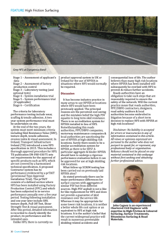 At the end of the two years, the system must meet minimum criteria including Skid Resistance Value (SRV), texture depth, tensile adhesion, erosion index & visual assessment. In Ireland, Transport Infrastructure Ireland (TII) introduced a new HFS specification in 2015. This includes a thorough approval procedure for HFS. TII publication DN-PAV-03075 sets out requirements for the approval of specific products such as HFS, which are not covered by a harmonised technical specification. A proposed Contractor system has its performance evidenced by a prTAIT (provisional Type Approval Installation Trial). The prTAIT consists of a defined section where HFS has been installed using Factory Production Control (FPC) and which has been subjected to in-service performance annually over a five year period. Testing following installation and one year later include SRV, texture depth, Pull Off Test, Shear Strength Test & visual assessment. After this period, detailed information is recorded to clearly identify the product, its performance and the intended uses.