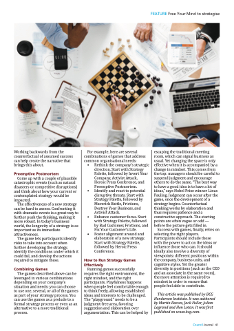 escaping the traditional meeting room, which can signal business as usual. Yet changing the space is only effective when it is accompanied by a change in mindset. This comes from the top: managers should be careful to suspend judgment and encourage others to do the same. “The best way to have a good idea is to have a lot of ideas,” says Nobel Prize winner Linus Pauling. Judgment can occur after the game, once the development of a strategy begins. Counterfactual thinking works by elaboration and thus requires patience and a constructive approach. The starting points are often vague or odd — before the picture gets filled in.
