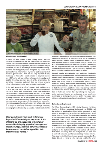 In the early years of an officer’s career, Mark explains, rank is what you draw on as you learn the elementary aspects of command. “In the early years of your career, rank is what you rely on, it gives you a platform to develop and learn. Troops under your command will follow you because of your rank when you are a young Lieutenant. But as you progress that changes. From the rank of Captain onward, in my opinion, they won’t follow you because of rank, they’ll follow you because of your experience, your values and how you do your work.” This is what Mark refers to as a style of leadership, which he learned through constantly challenging himself to develop as a leader. He believes that while