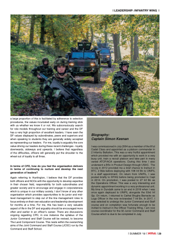 a large proportion of this is facilitated by adherence to selection procedures, the values inculcated early on during training stick with us whether we know it or not. We subconsciously search for role models throughout our training and career and the DF has a very high proportion of excellent leaders. I have seen the DF values displayed by subordinates, peers and superiors and when speaking to students they are generally widely accepted as representing our leaders. For me, loyalty is arguably the core value driving our leaders during these recent challenges - loyalty downwards, sideways and upwards. I believe that regardless of the difficulties, officers will generally put the shoulder to the wheel out of loyalty to all three.