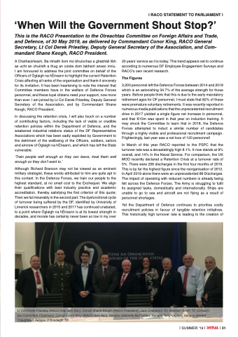 This is the RACO Presentation to the Oireachtas Committee on Foreign Affairs and Trade, and Defence, of 30 May 2019, as delivered by Commandant Conor King, RACO General Secretary, Lt Col Derek Priestley, Deputy General Secretary of the Association, and Com- mandant Shane Keogh, RACO President.