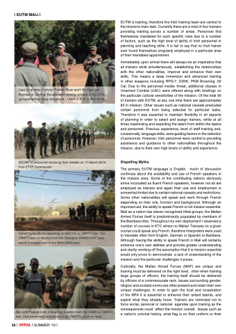 Immediately upon arrival there will always be an imperative that all trainers while simultaneously establishing the relationships with the other nationalities, improve and enhance their own skills. This means a deep immersion and advanced training in other weapons including RPG-7, DShK, PKM Browning .50 Cal. Due to the perceived insider threat, additional classes in Unarmed Combat (UAC) were offered along with briefings on the particular cultural sensitivities of the mission. Of the total 90 of trainers with EUTM, at any one time there are approximately 80 in mission. Other issues such as national caveats precluded certain personnel from being selected for particular tasks. Therefore it was essential to maintain flexibility in all aspects of planning in order to select and assign trainers, while at all times maximising and exploiting the talent from within the teams and personnel. Previous experience, level of staff training and, occasionally, language skills, were guiding factors in the selection of personnel. However, Irish personnel were central to providing assistance and guidance to other nationalities throughout the mission, due to their own high levels of ability and experience.